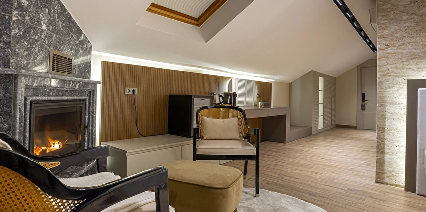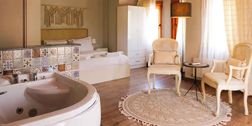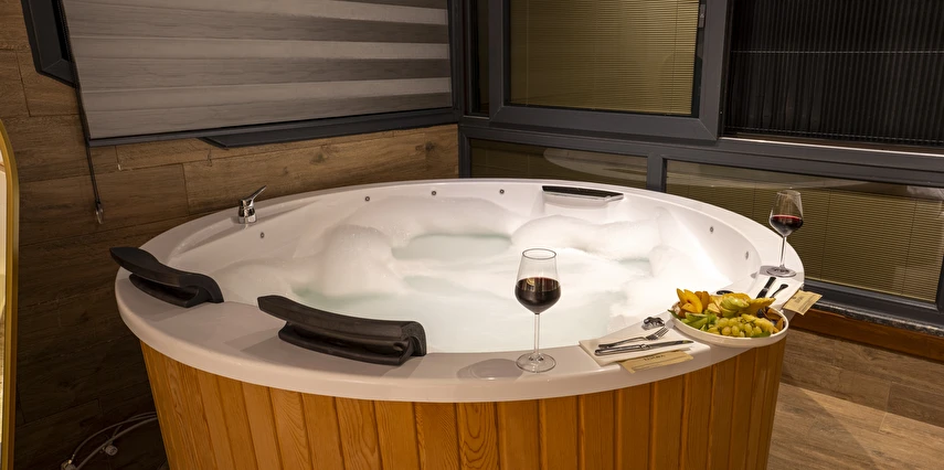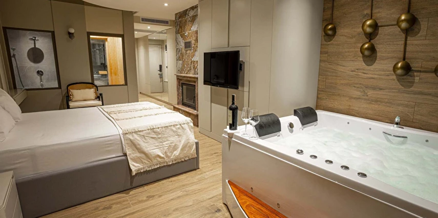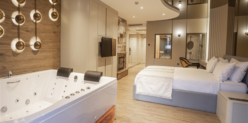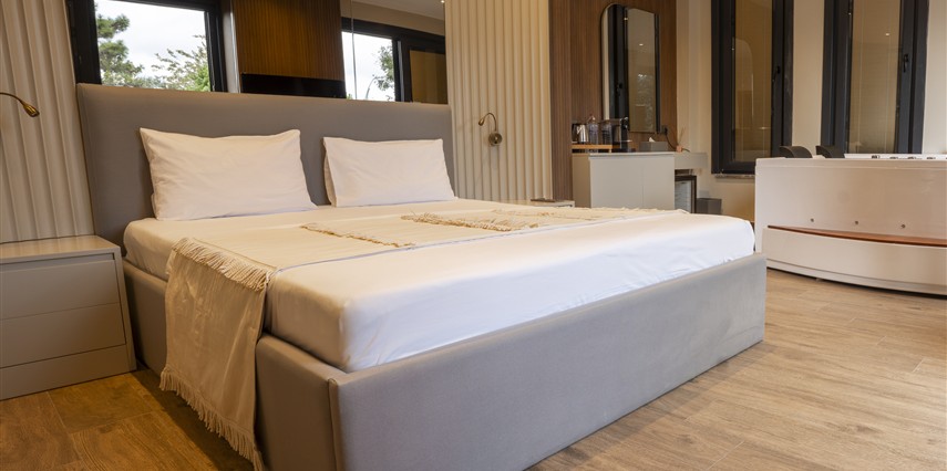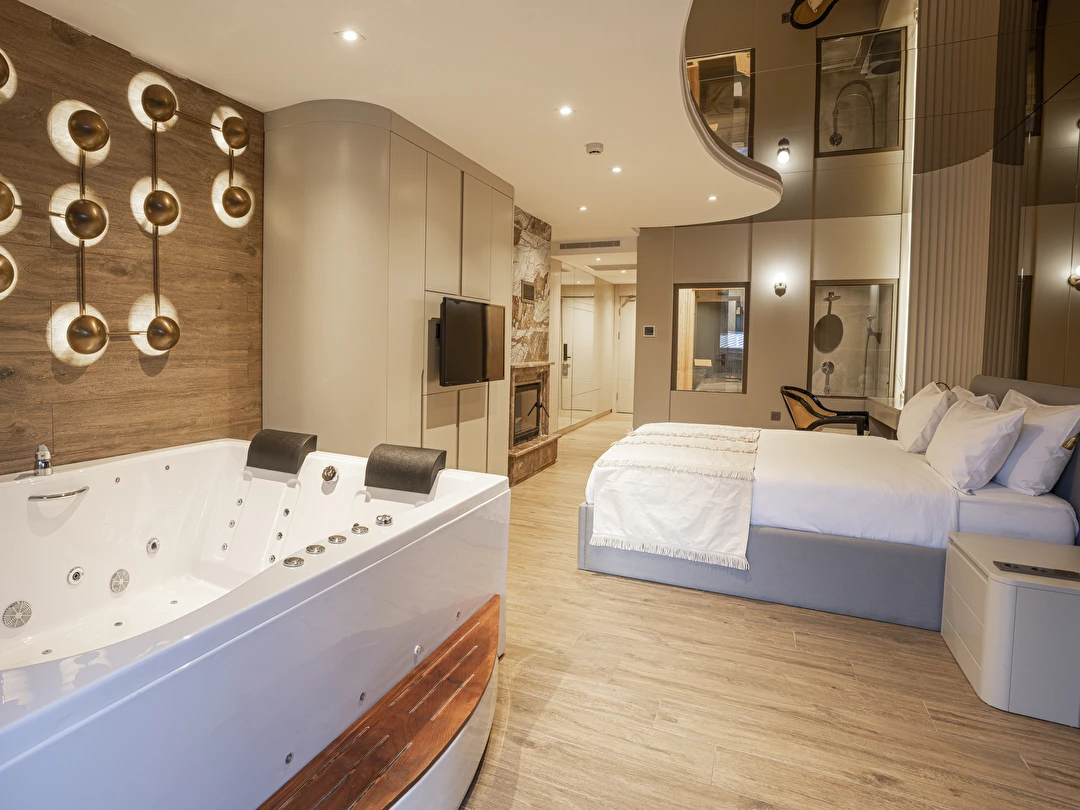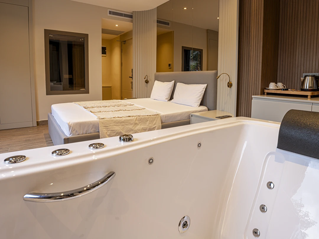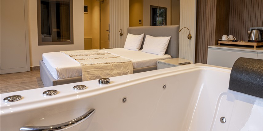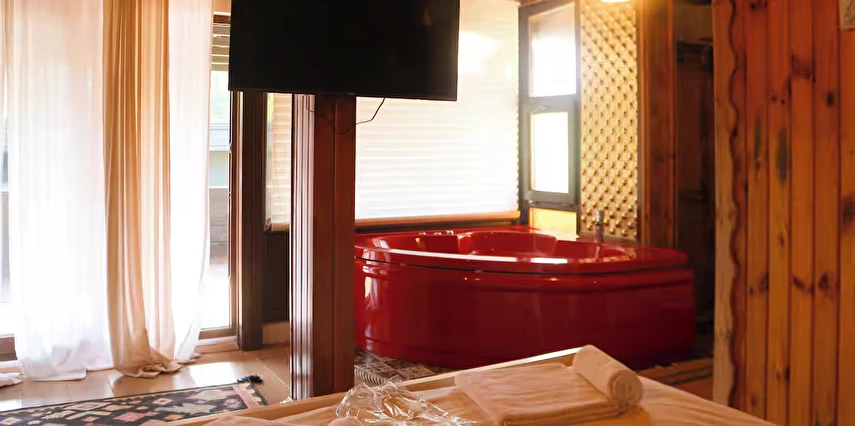 Jakuzili Suit Oda, Kısmi Nehir ve Havuz Manzaralı, Sauna ve Hamamlı, Jakuzili Balayı Odası, Bahçe Manzaralı, Sauna ve Hamamlı ve Çatı Katı Oda-Jakuzili, Dağ veya Havuz Manzaralı, Sauna ve Hamamlı tiplerinde 3. kişi için ilave yatak eklenebilmektedir.