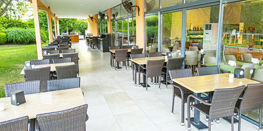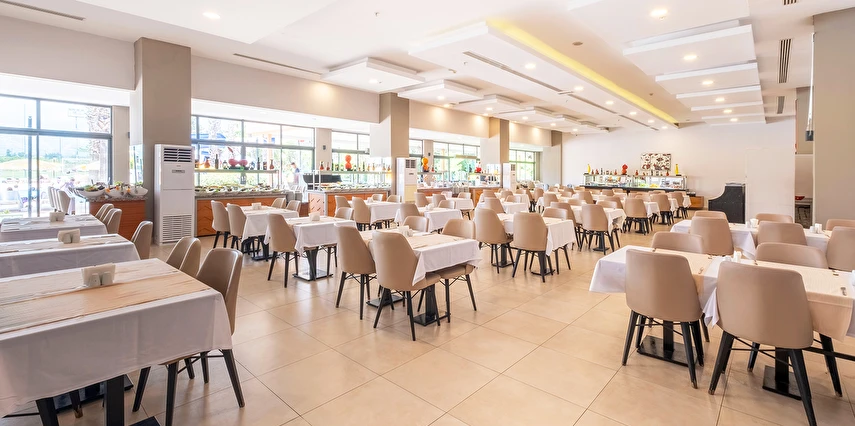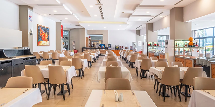 Sabah kahvaltısı, öğle ve akşam yemeği açık büfe olup tesisin belirlediği markalar dahilinde yerli alkollü ve alkolsüz içecekler 10:00 ile 23:00 saatleri arasında ücretsizdir. İthal içecekler, taze sıkılmış meyve suları, dondurma, şişeli ve kutulu içecekler, alkollü kokteyller, türk kahvesi, espresso ve cappuchino ekstra ücretlidir.
