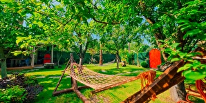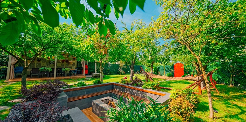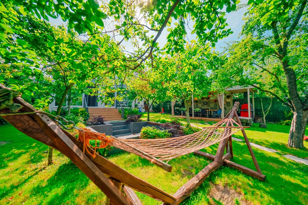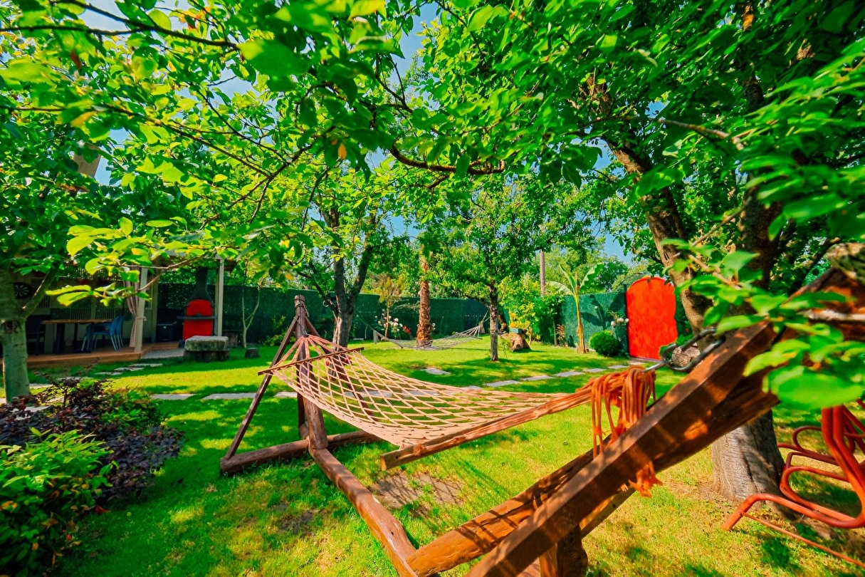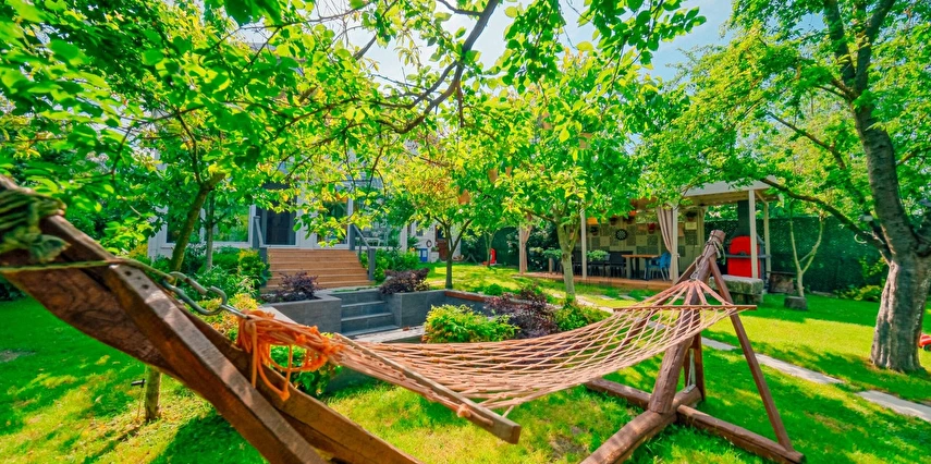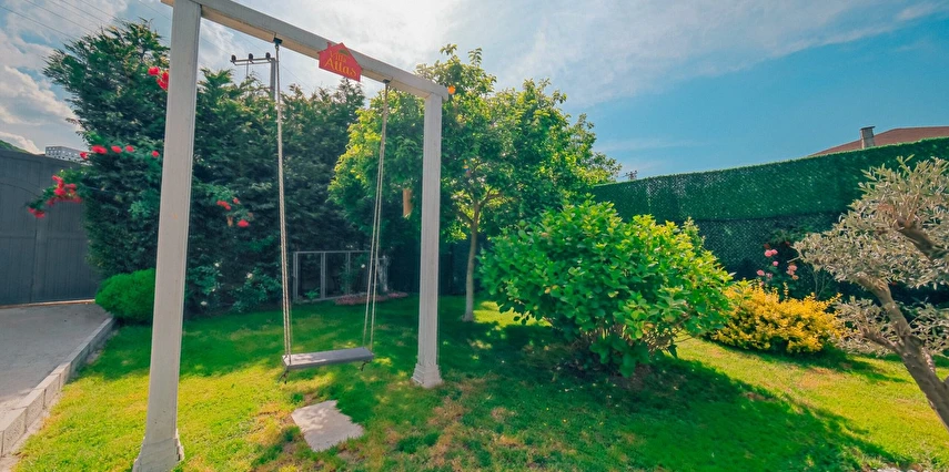 Bahçede hamaklar, salıncak ve mangalımız mevcuttur. Ev ve bahçe içerisinde çocuklarınız güvenle mevcut oyuncaklarla oynarken sizde bahçenin ve doğanın tadını çıkarabilirsiniz. Mevsiminde bahçede yetişen erik, kiraz, şeftali, armut, hünnap ve üzümleri dalından toplayıp yiyebilirsiniz.