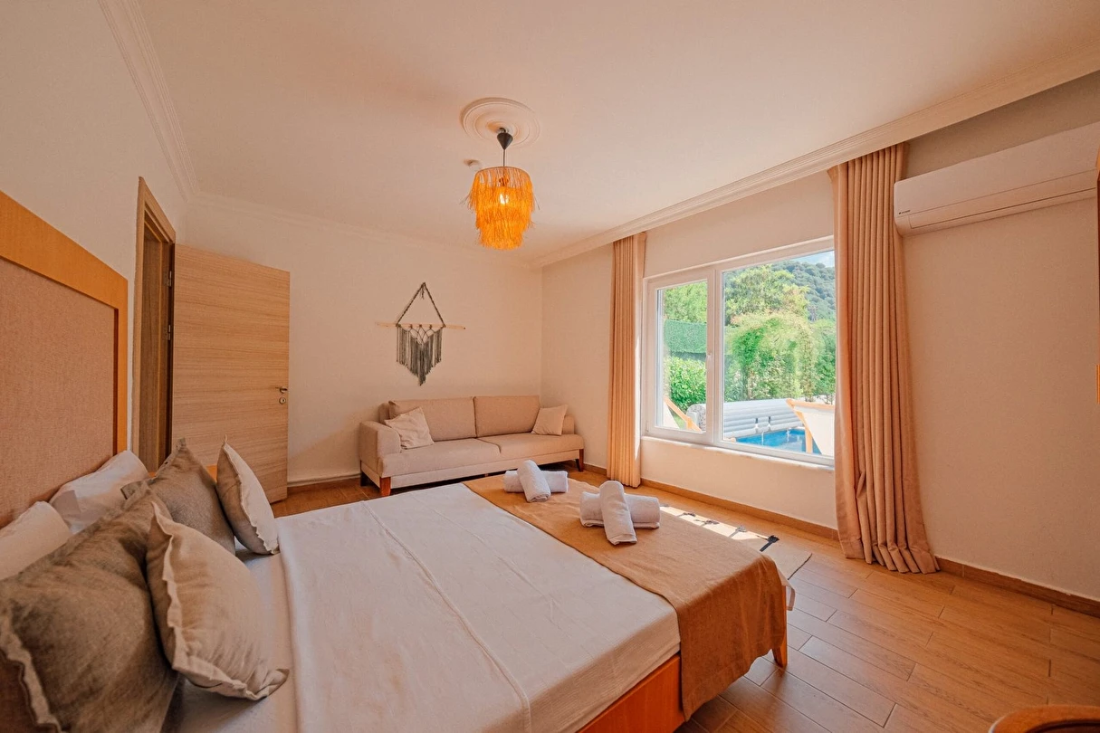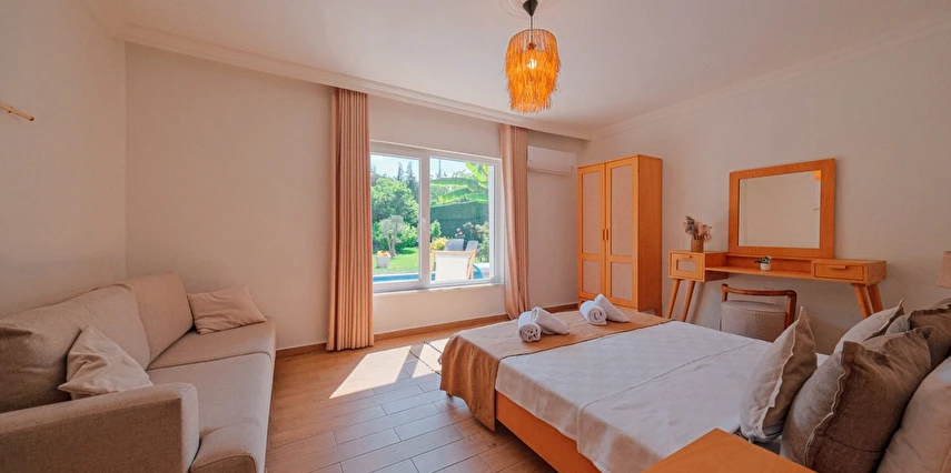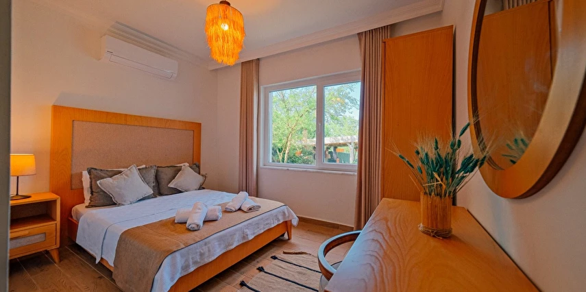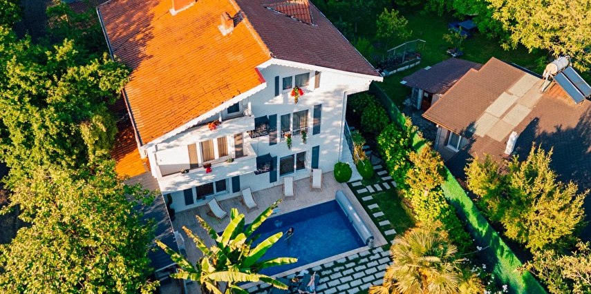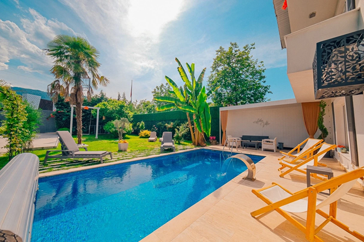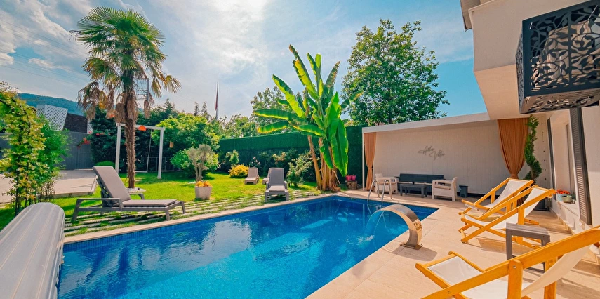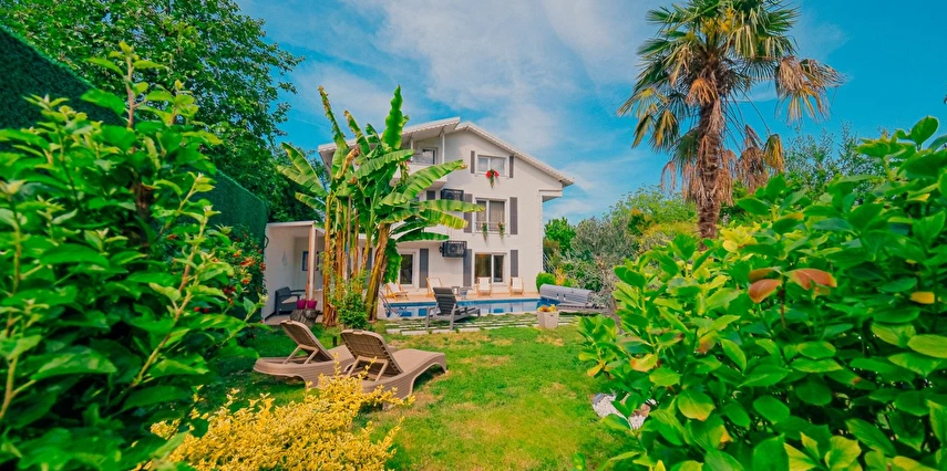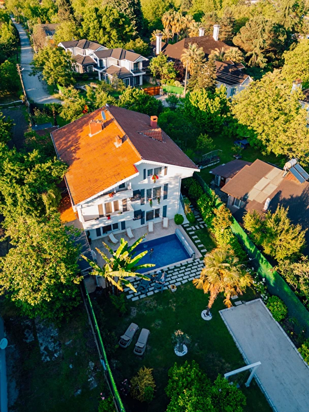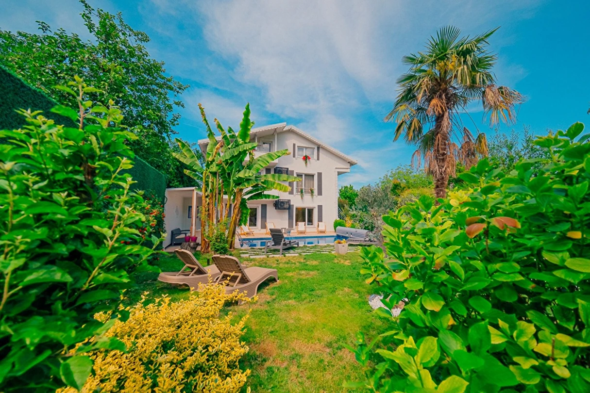 Tesisimiz bir dönüm bahçe içinde, korunaklı yüksek duvarları ile misafirlerinin mahremini önemseyen güvenlikli, 6 yatak odalı 5 banyolu 360 m² kullanım alanına sahip, uzun tatil konaklamaları için uygun, iki katlı müstakil villadır.
