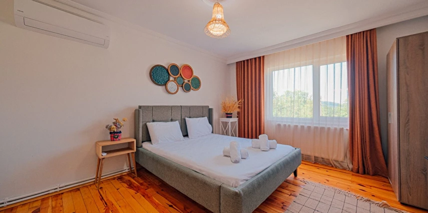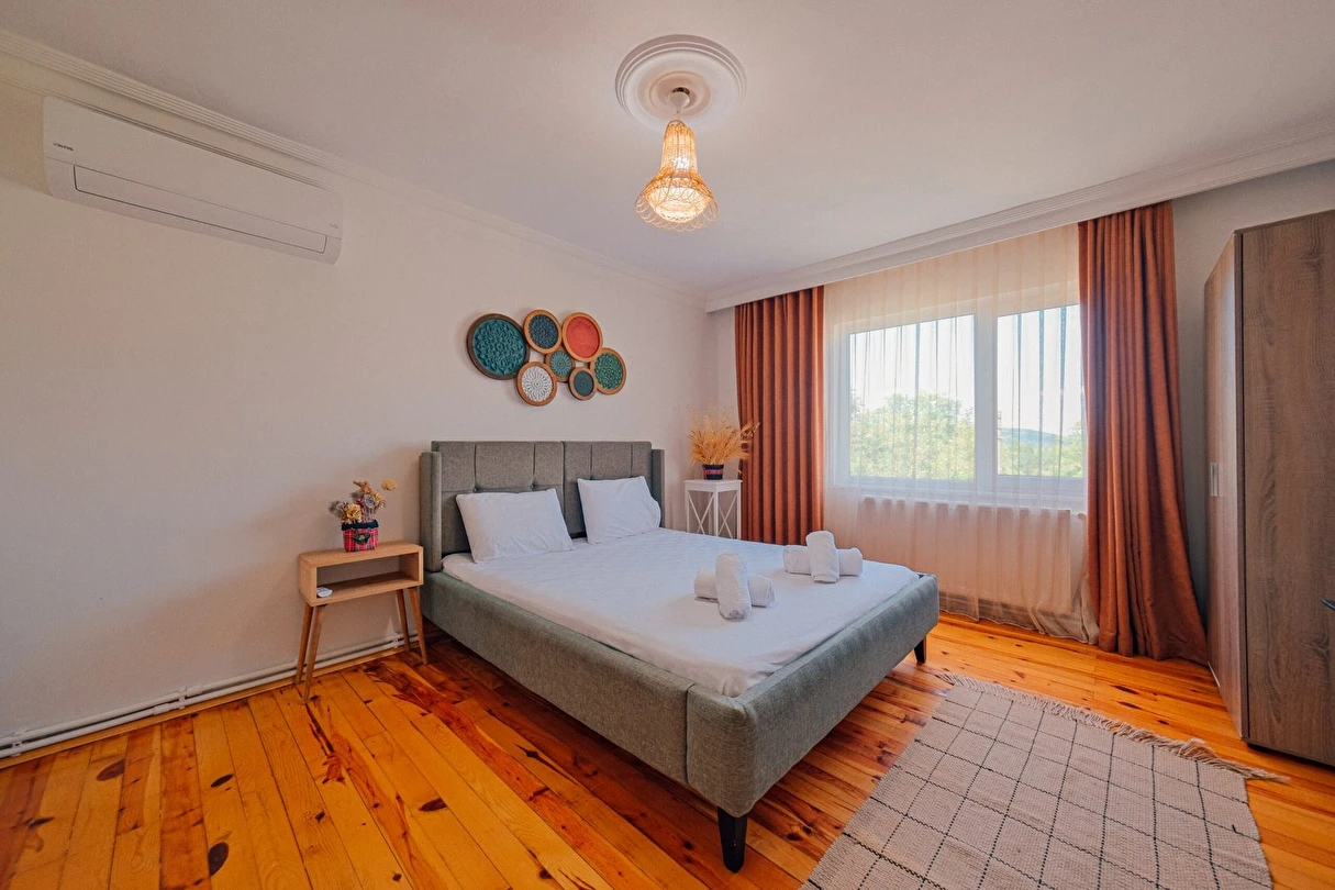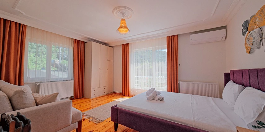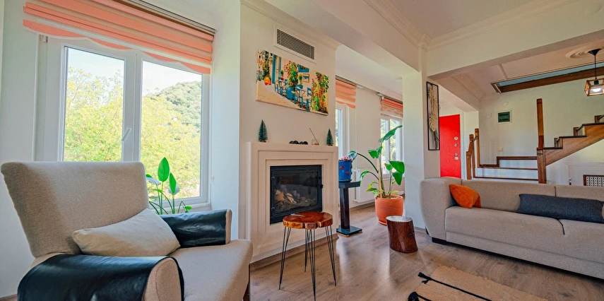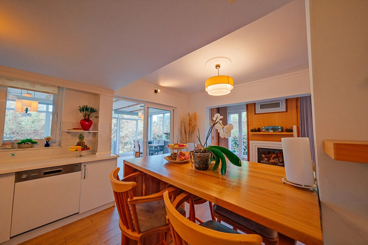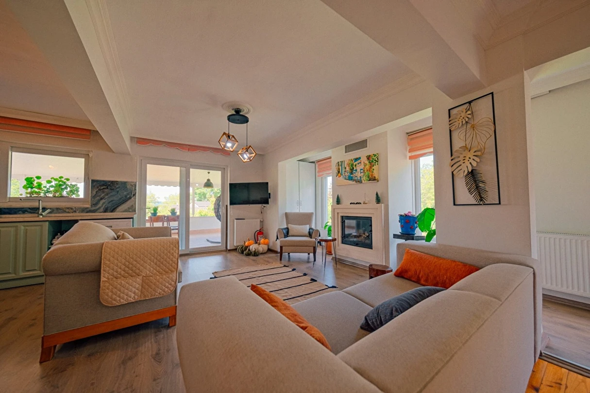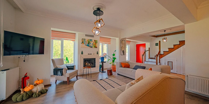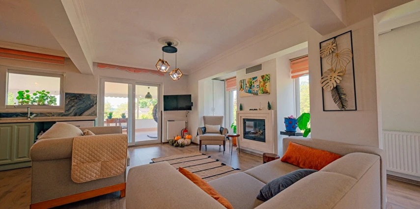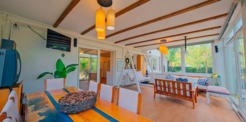Sapanca Villa Atlas'ta 3 oda + 3 banyo, açık mutfak, salonda odun şöminesi, 30 m² camlı veranda ve doğalgaz şöminesi, üstü kapalı çardak, barbekü, otopark, Wi-Fi, Led tv, klima, doğalgaz ile alttan ısıtma, tüm bahçe korunaklıdır dışarıdan görünmez.