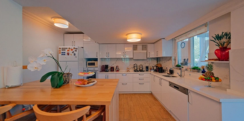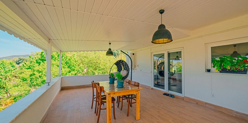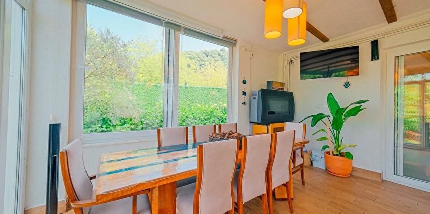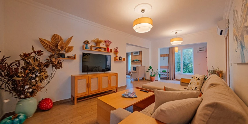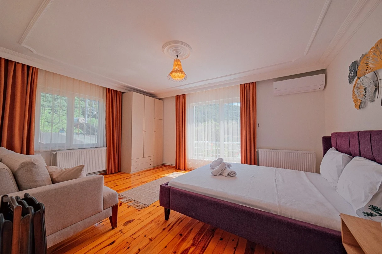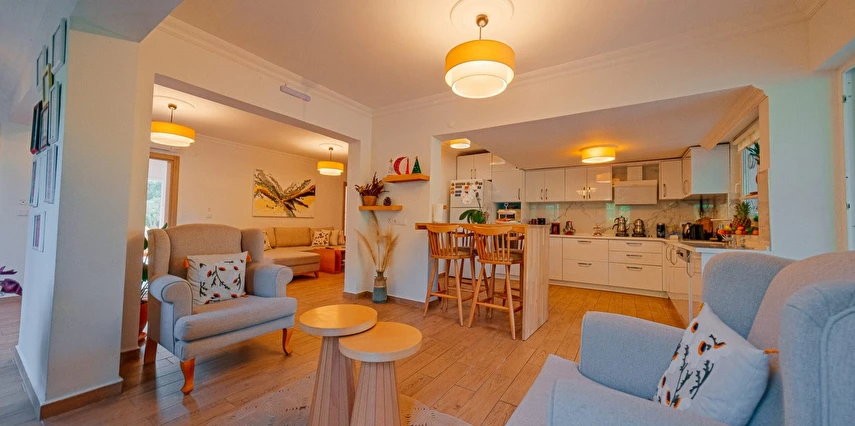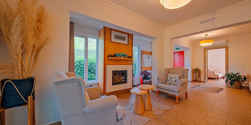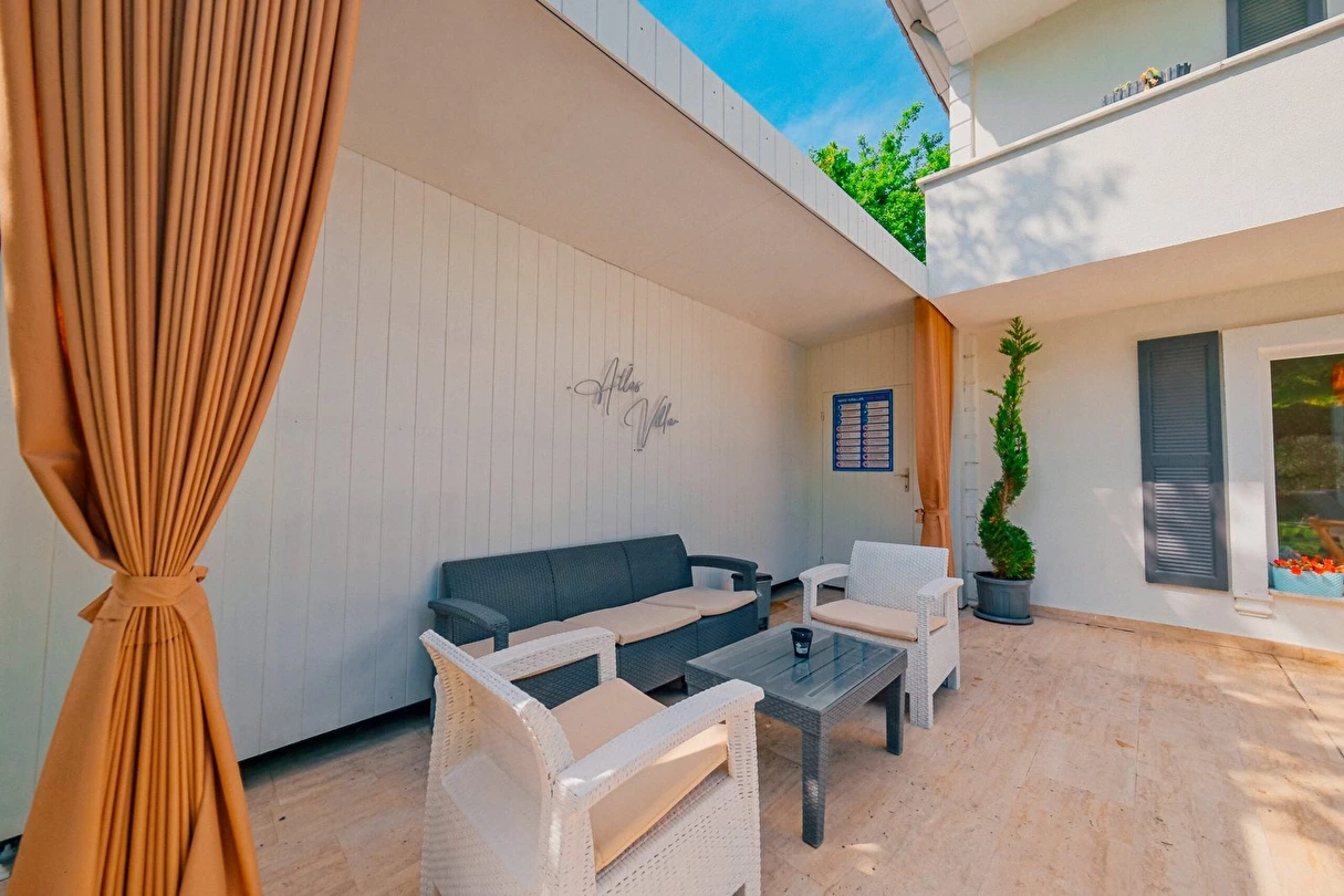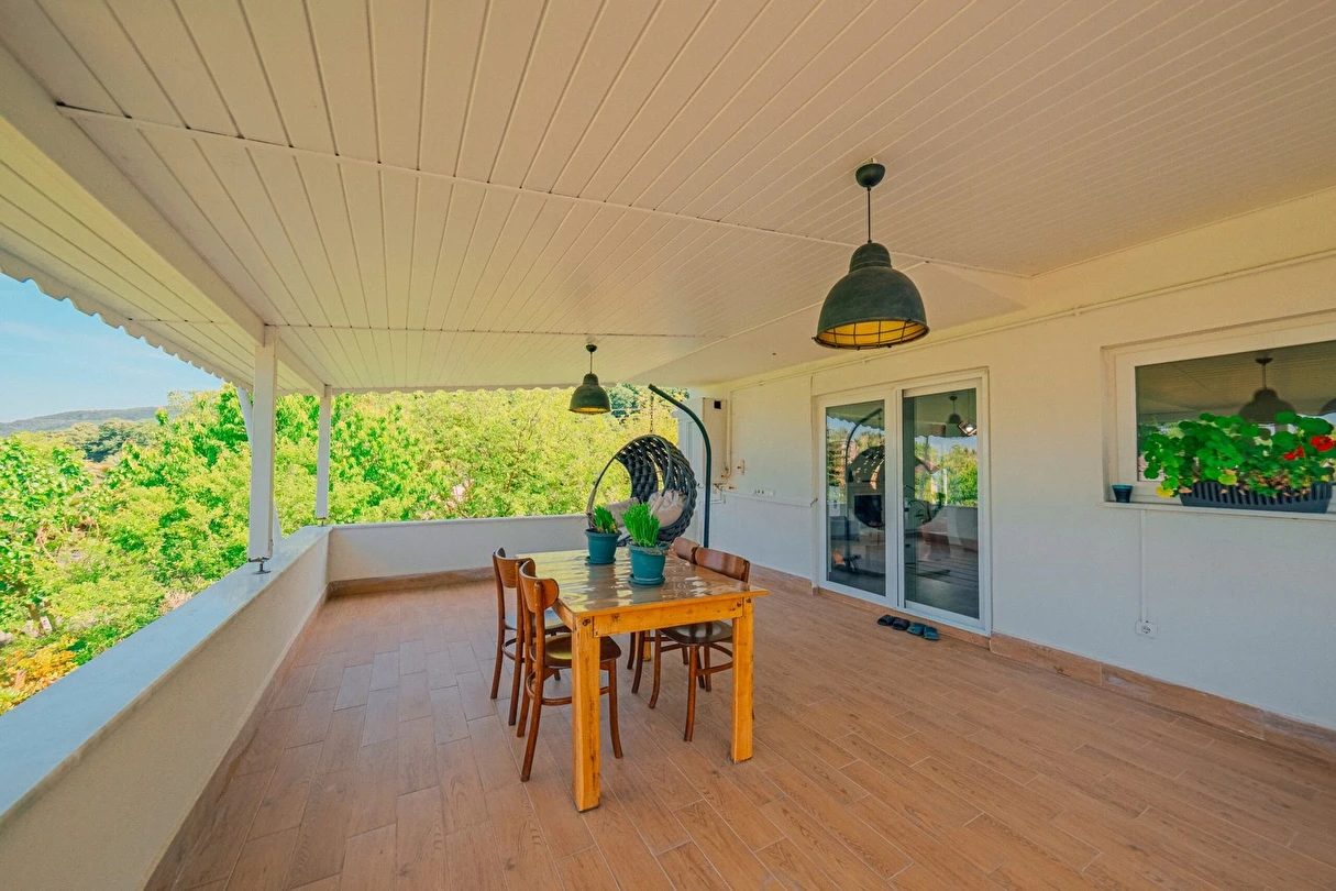 Sapanca Villa Atlas'ta 3 oda + 3 banyo, açık mutfak, salonda odun şöminesi, 30 m² camlı veranda ve doğalgaz şöminesi, üstü kapalı çardak, barbekü, otopark, Wi-Fi, Led tv, klima, doğalgaz ile alttan ısıtma, tüm bahçe korunaklıdır dışarıdan görünmez.