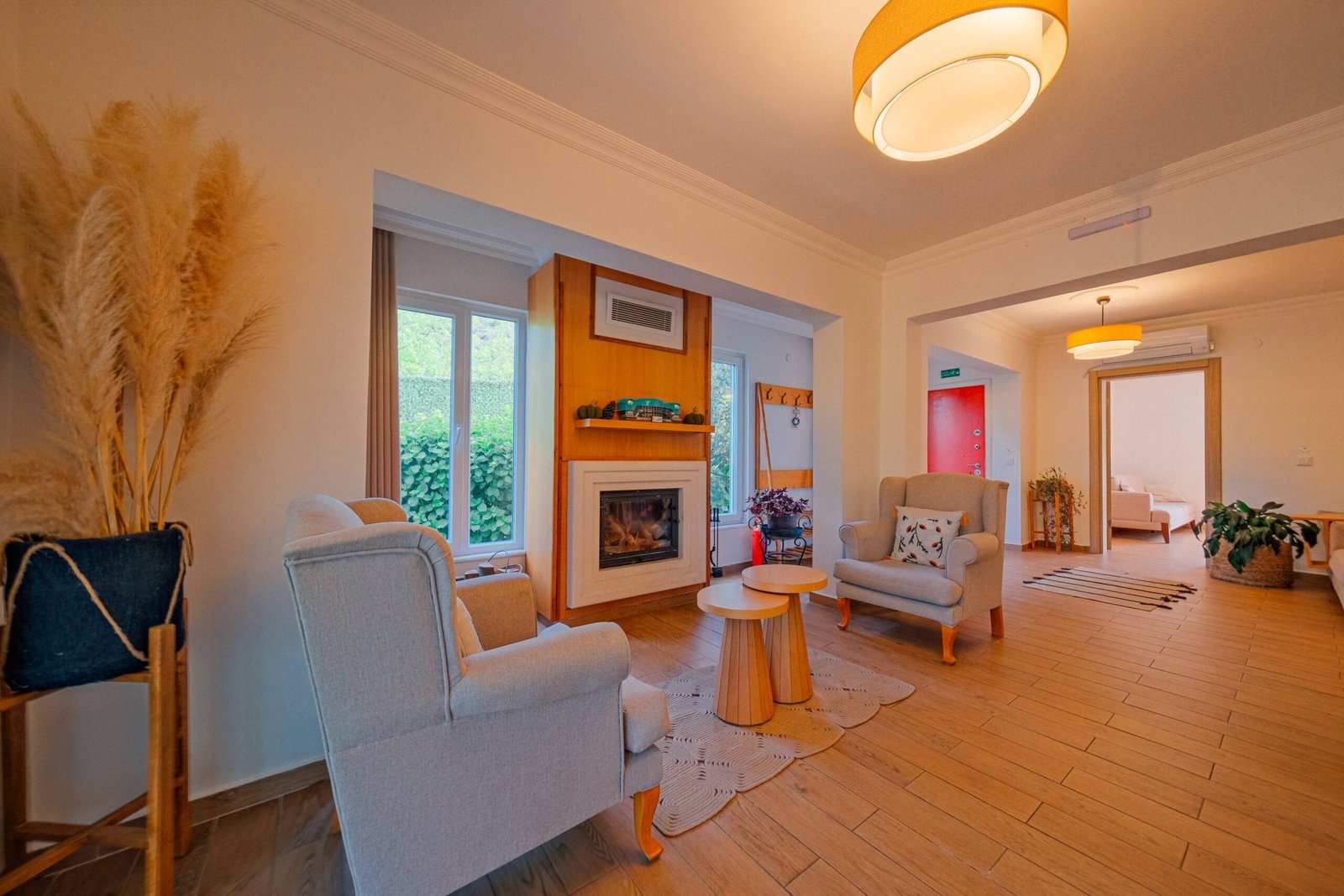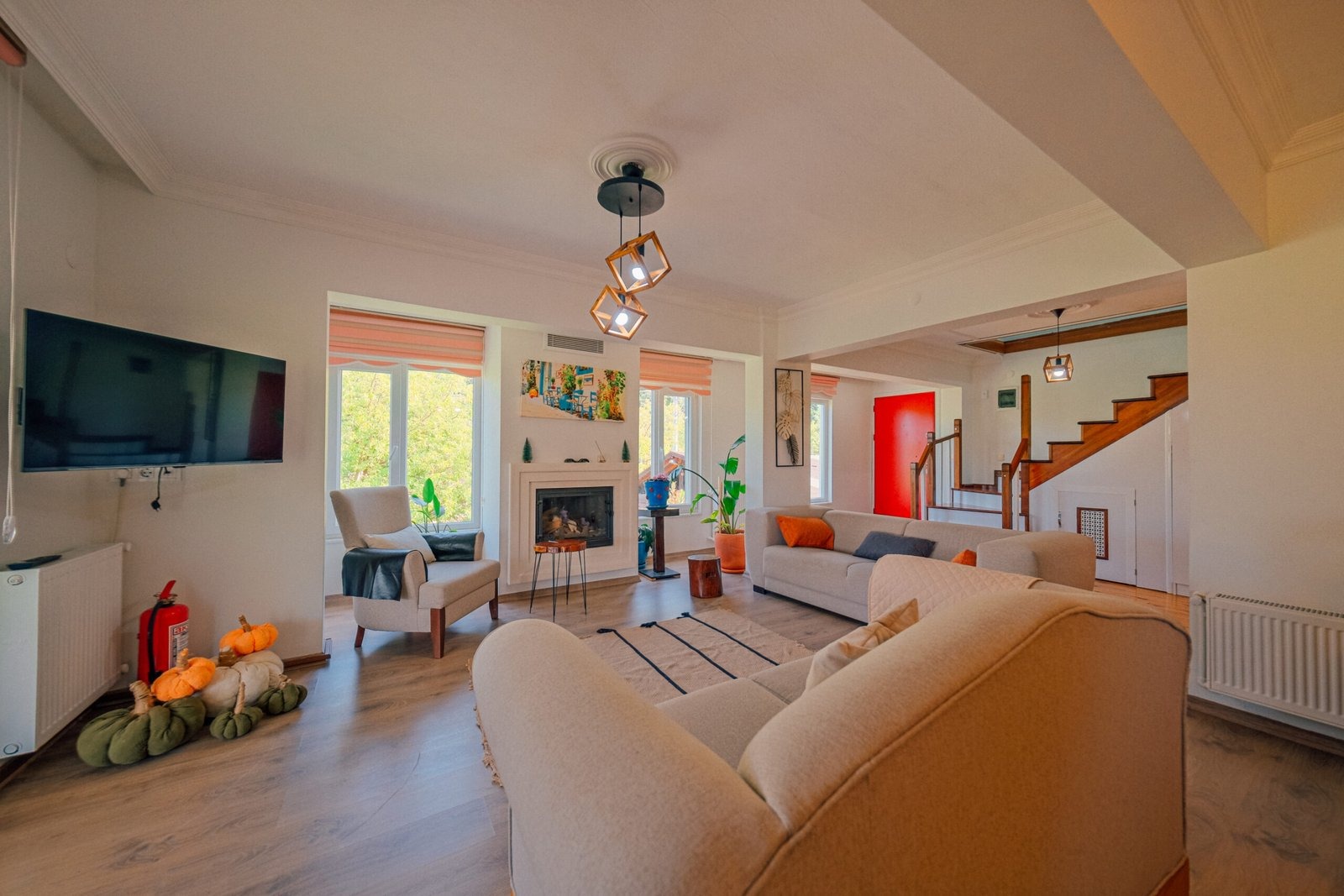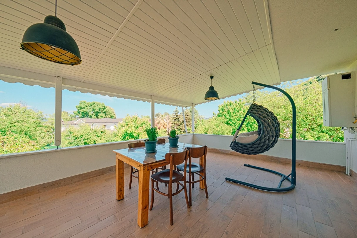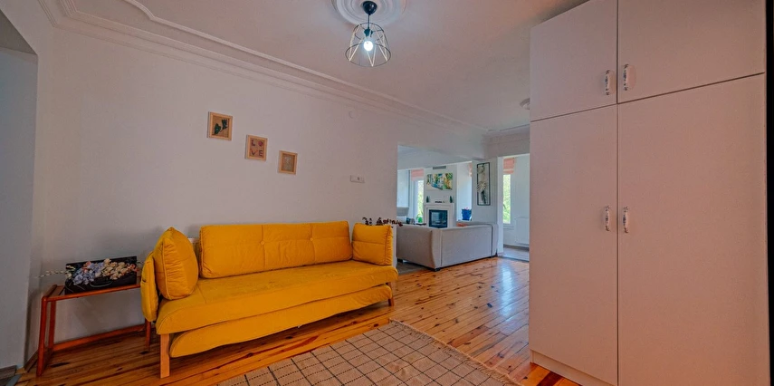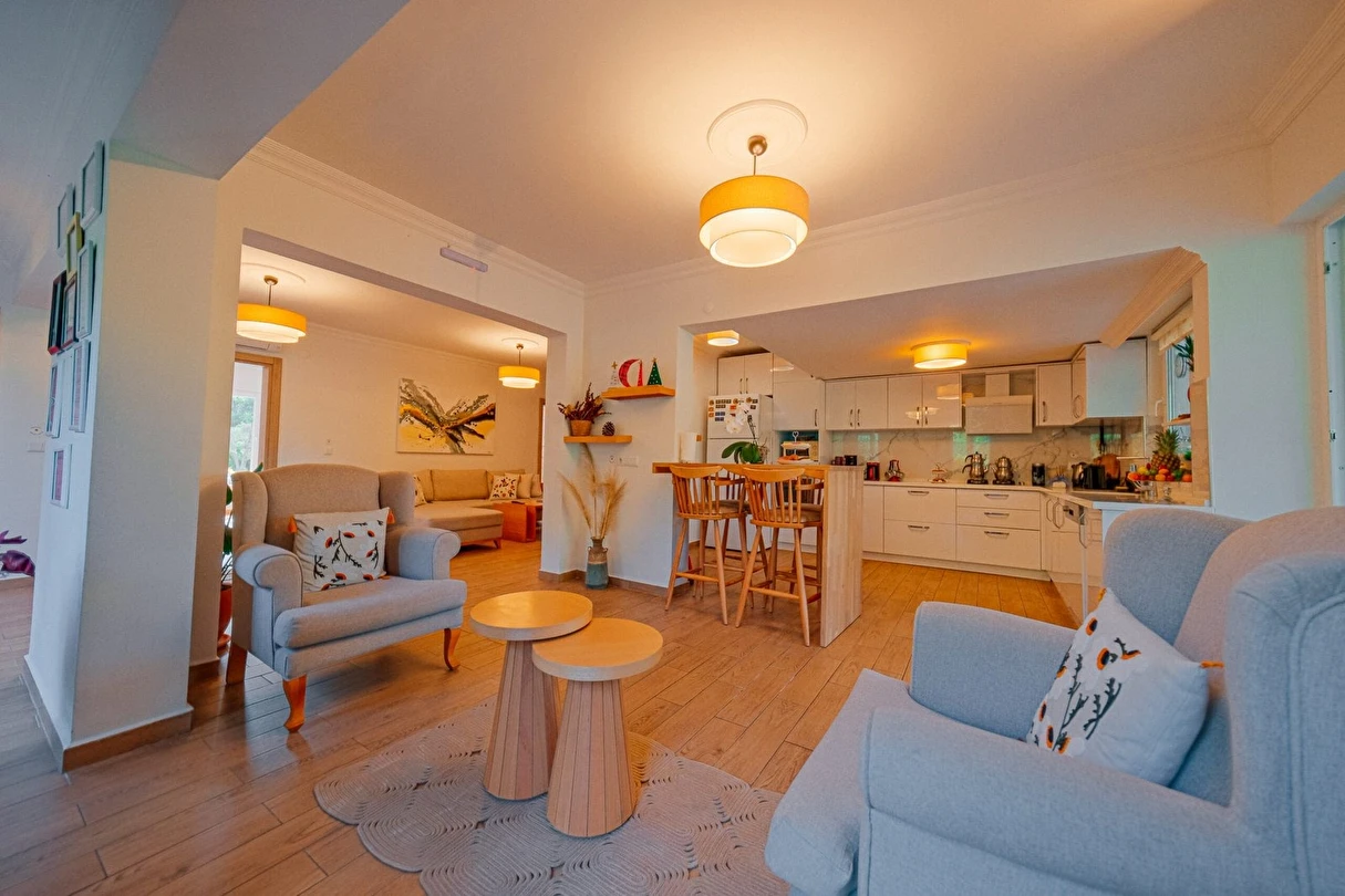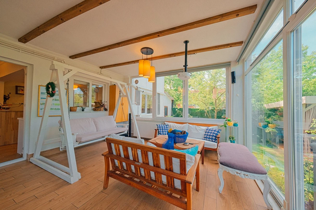 Sapanca Villa Atlas'ta 3 oda + 3 banyo, açık mutfak, salonda odun şöminesi, 30 m² camlı veranda ve doğalgaz şöminesi, üstü kapalı çardak, barbekü, otopark, Wi-Fi, Led tv, klima, doğalgaz ile alttan ısıtma, tüm bahçe korunaklıdır dışarıdan görünmez.