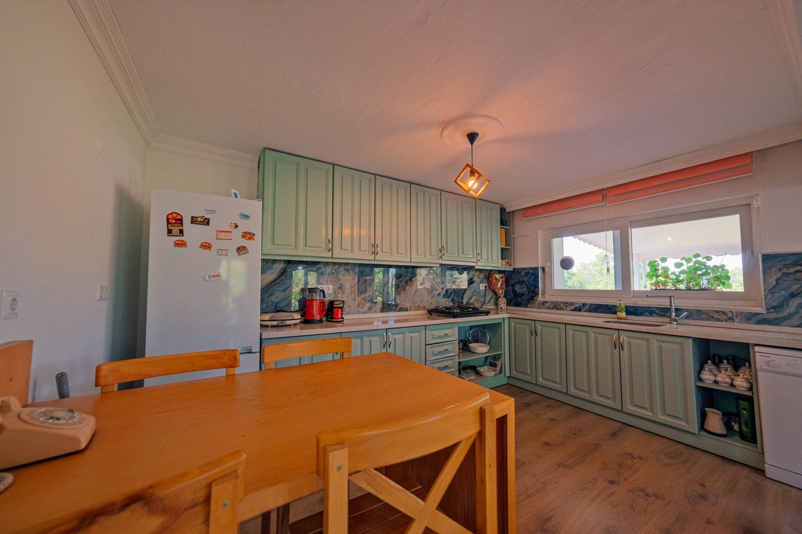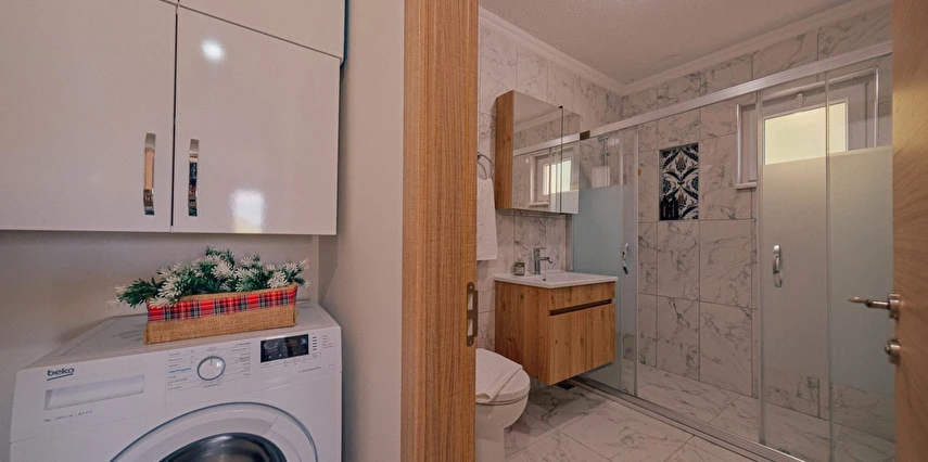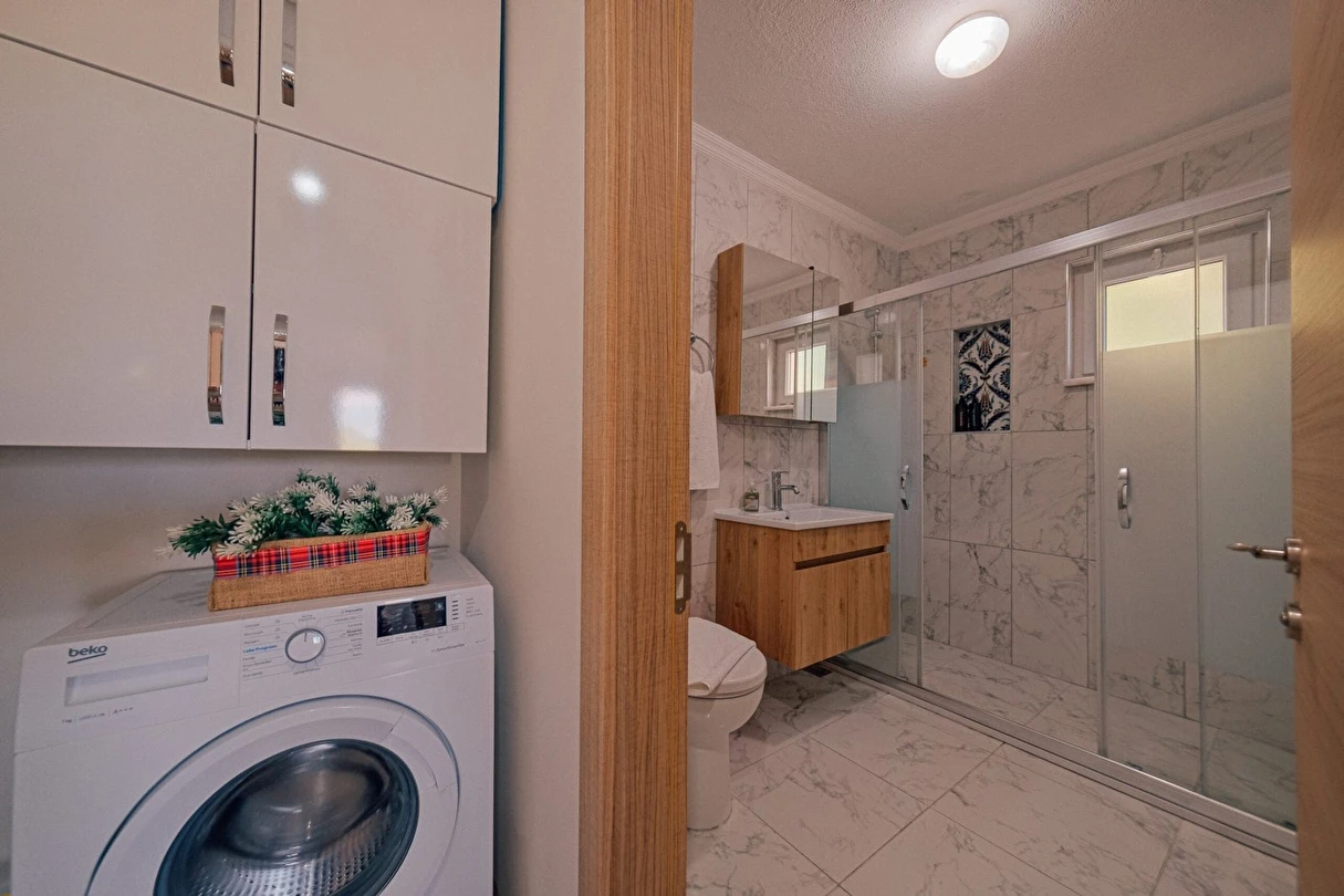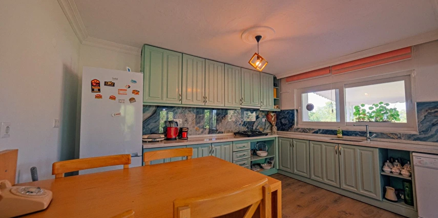 Bulaşık makinesi, çamaşır makinesi, ütü, buzdolabı, fırın, ocak, mikrodalga fırın, filtre kahve ve Türk kahve makinesi, her türlü mutfak ve banyo gereçleri bulunmaktadır.