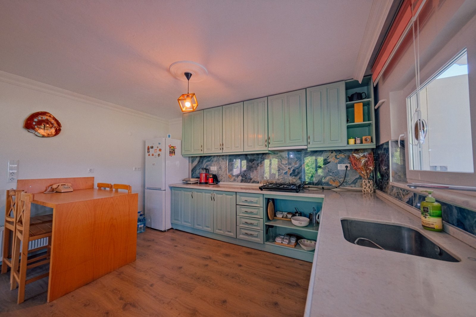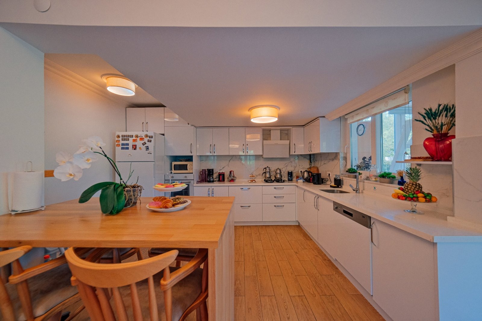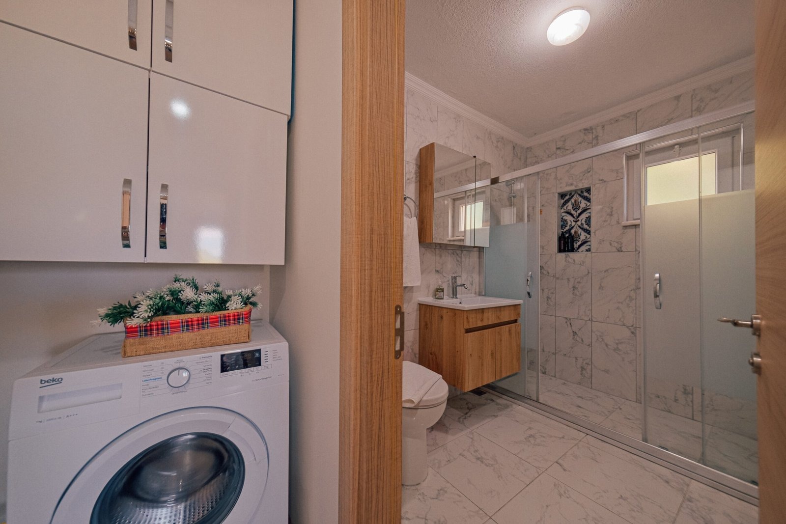 Bulaşık makinesi, çamaşır makinesi, ütü, buzdolabı, fırın, ocak, mikrodalga fırın, filtre kahve ve Türk kahve makinesi, her türlü mutfak ve banyo gereçleri bulunmaktadır.