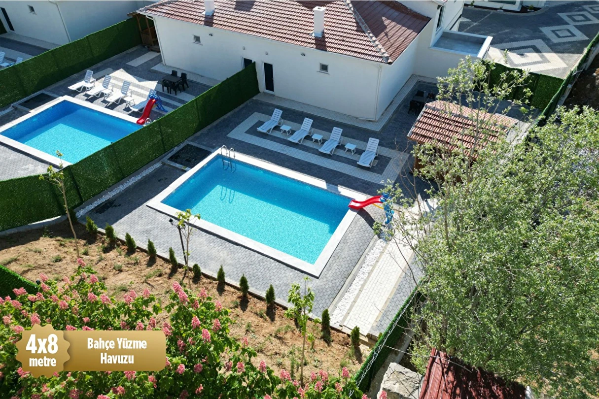 32m² Açık Havuz, 180m² Geniş Bahçe, Villa İçi Kapalı Termal Havuz, Türk Hamamı, Ferah Salon, Amerikan Mutfak, 3 Adet Yatak Odası, Jakuzi ve Sauna ile rahatınız düşünülerek tasarlanmıştır. Özel ebeveyn yatak odasında 1 adet çift kişilik yatak, Misafir odasında 2 adet tek kişilik (birleştirilebilir) yatak, Çocuk odasında 2 adet tek kişilik yatak, Oturma Grubu, 6 Kişilik Yemek Masası, Tüm mutfak araç gereçleri ve küçük büyük elektronik ev aletleri. Barbekü Alanı, Kamelya, Ateş Çukuru, Şezlong, 2 Kişilik Bahçe Salıncağı, Armut Salıncak, Duş Kabinleri, 2 Adet Ebeveyn Banyosu, 3 Adet WC, 2 Adet Saç Kurutma Makinesi, 2 Adet Akıllı Televizyon, Yüksek Hızda İnternet, Telefon, Buzdolabı, Bulaşık Makinesi, Elektronik 4’lü Ocak, Fırın, Peyzaj Alanımız, Kettle, Çaycı Seti, Kahve Makinesi, Dijital Tartı, Çamaşır Makinesi, Boy Aynası ve 6 Kişilik Bornoz ve Havlu bulunmaktadır.