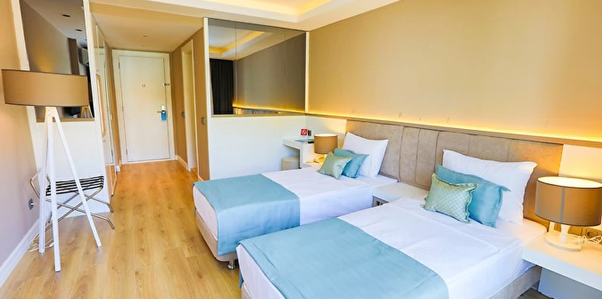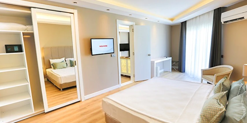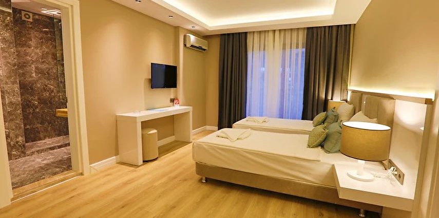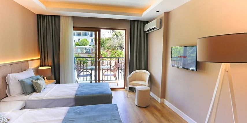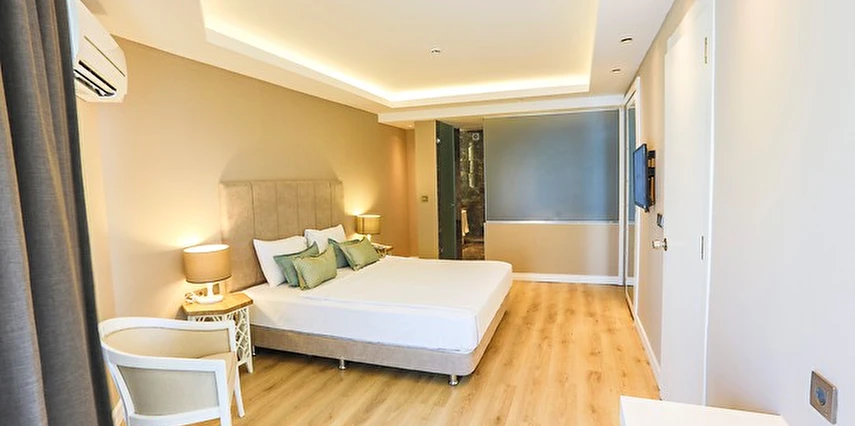 Otelin klimalı ve ferah odaları, nötr tonlar ve ahşap detaylarla dekore edilmiş olup modern bir atmosfer sunar. Tüm odalarda balkon bulunmakta, bazı odalar ise büyüleyici deniz manzarası ve özel spa küveti gibi ayrıcalıklarla öne çıkmaktadır.