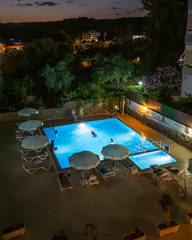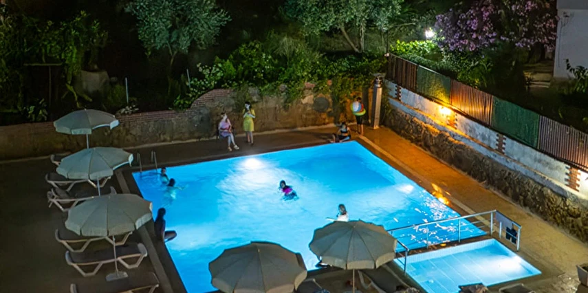 Tesiste ayrıca açık yüzme havuzu ve bahçede restoran/restoran alanı gibi sosyal alanlar bulunur. Sabahları açık büfe kahvaltı servis edilirken, akşam yemekleri de restoran bölümünde sunulmaktadır.