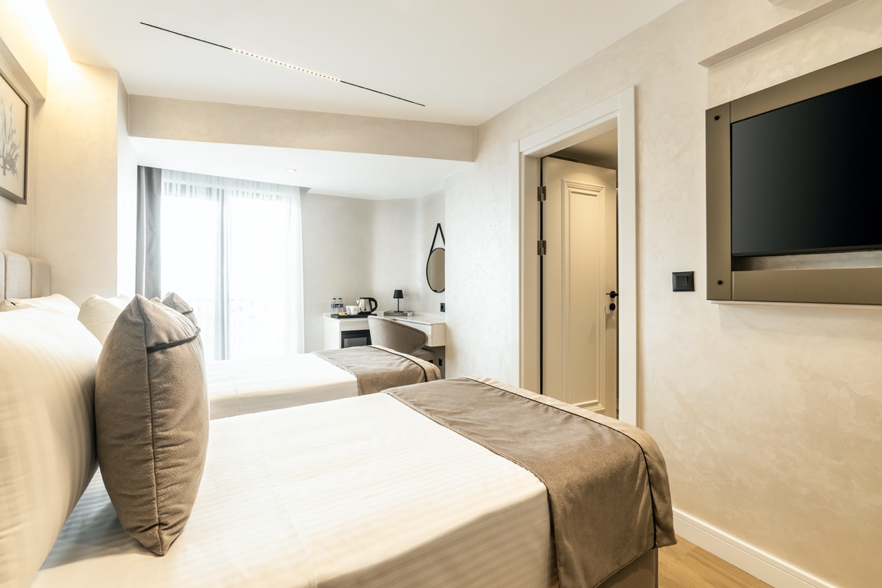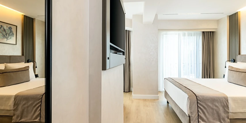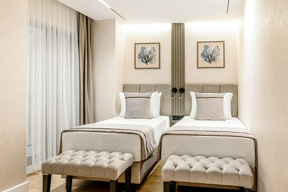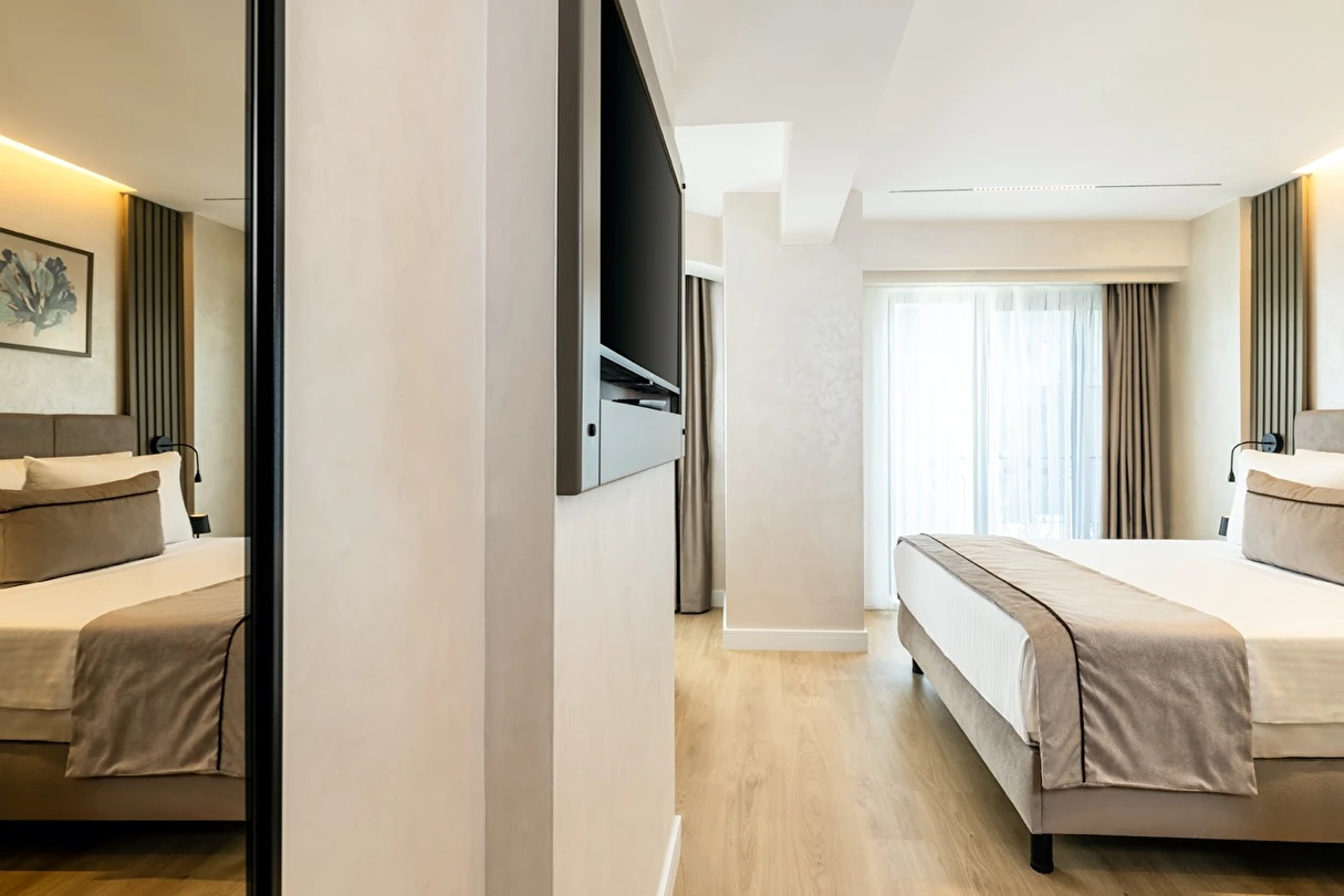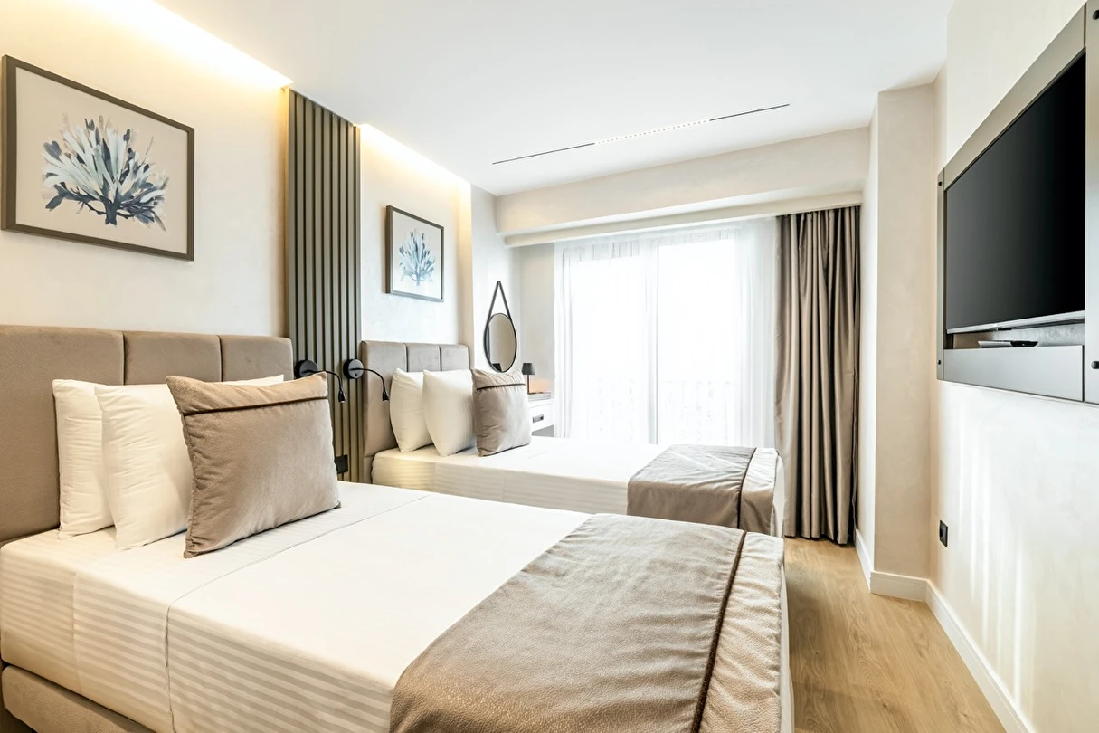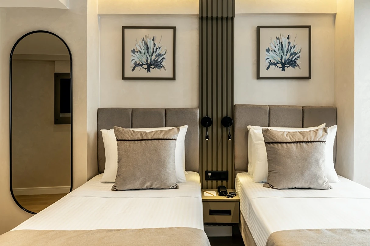 Burada odalar sadece birer konaklama alanı değil; bir ruh hâlidir.22–29 m² arasında değişen, incelikle tasarlanmış yaşam alanlarında ışık yumuşakça duvarlara yayılır. French ve Twin yatak seçenekleriyle her detay konforu fısıldar. İki kişilik odalarda sade bir şıklık, üç kişilik seçeneklerde paylaşılmış anların sıcaklığı saklıdır. Superior odalardaki oturma grupları ise günü yavaşlatmak için tasarlanmış küçük bir sahne gibidir; bir fincan kahve, bir kitap, bir İstanbul akşamı…