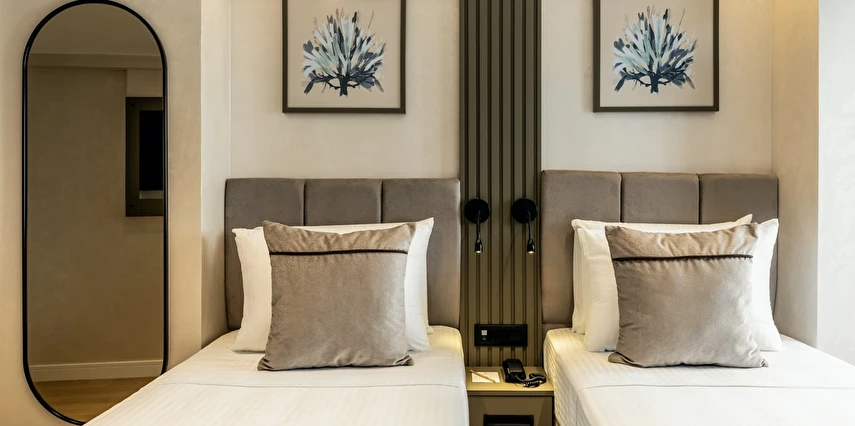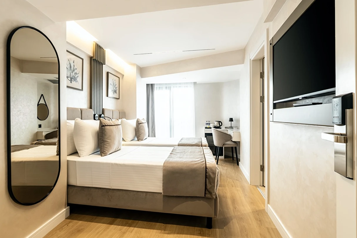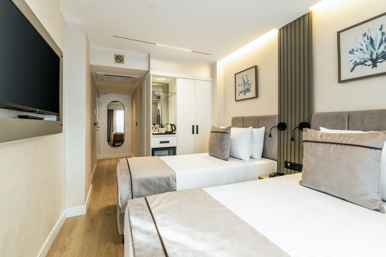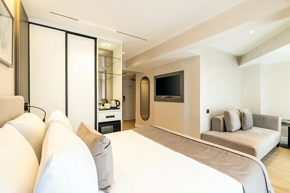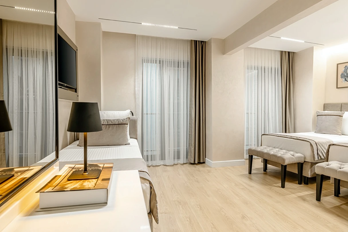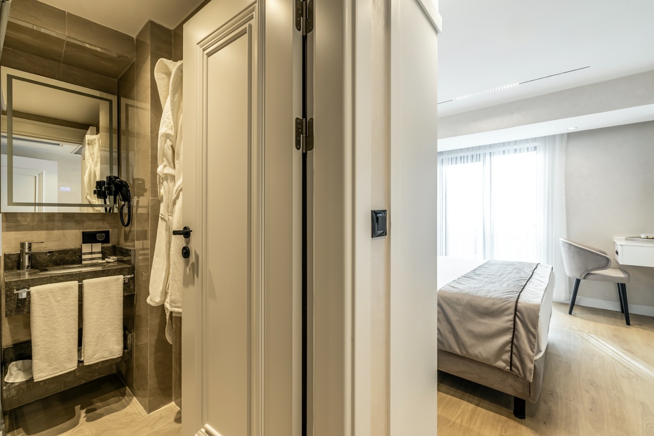 Burada odalar sadece birer konaklama alanı değil; bir ruh hâlidir.22–29 m² arasında değişen, incelikle tasarlanmış yaşam alanlarında ışık yumuşakça duvarlara yayılır. French ve Twin yatak seçenekleriyle her detay konforu fısıldar. İki kişilik odalarda sade bir şıklık, üç kişilik seçeneklerde paylaşılmış anların sıcaklığı saklıdır. Superior odalardaki oturma grupları ise günü yavaşlatmak için tasarlanmış küçük bir sahne gibidir; bir fincan kahve, bir kitap, bir İstanbul akşamı…