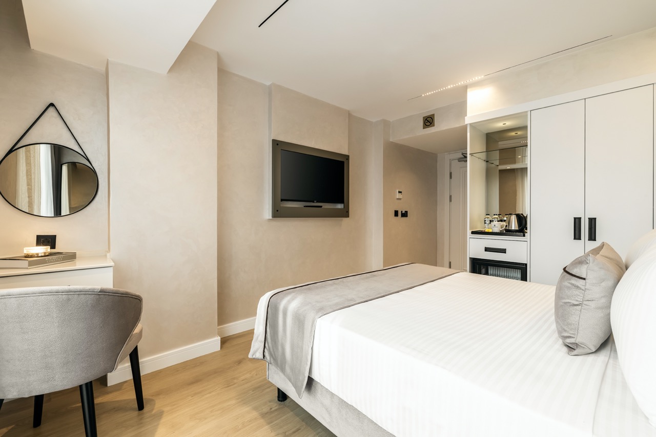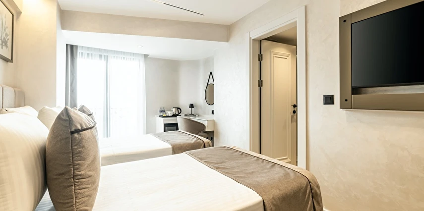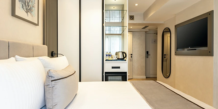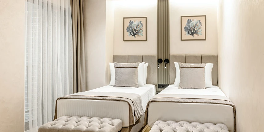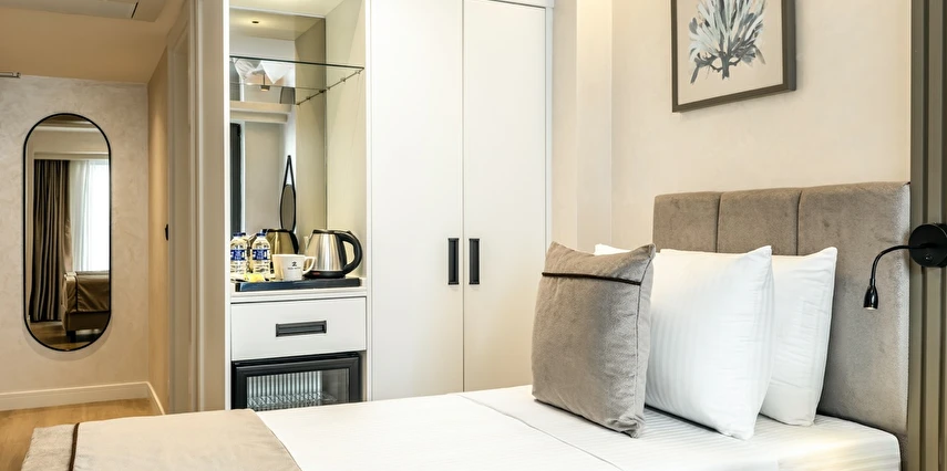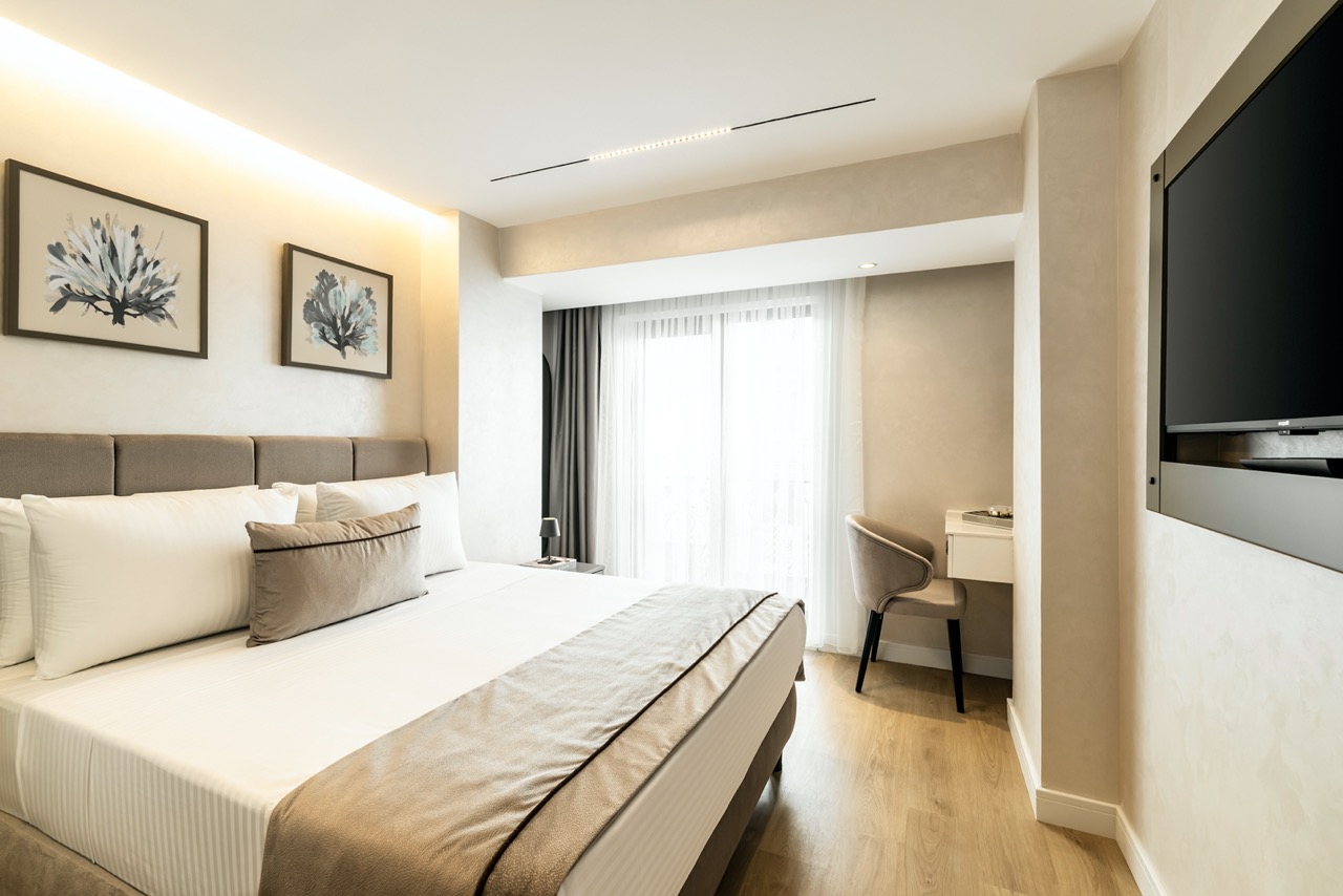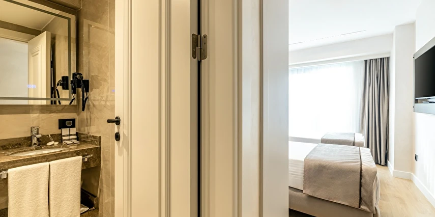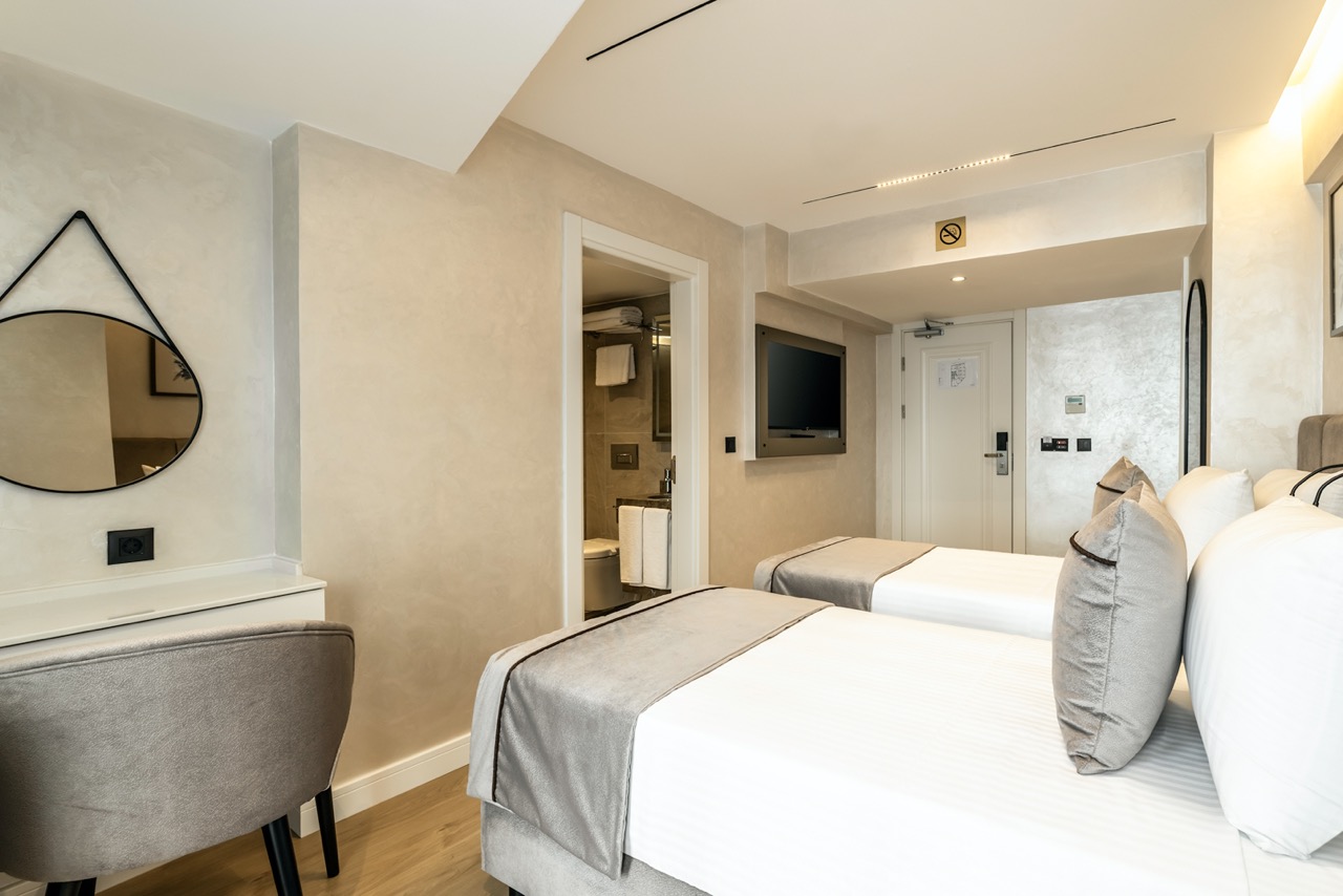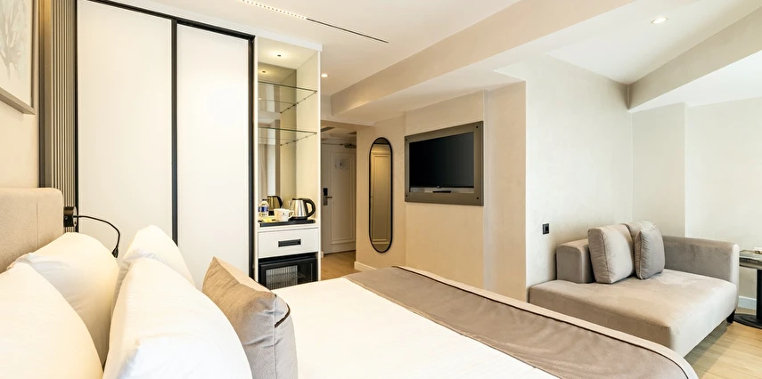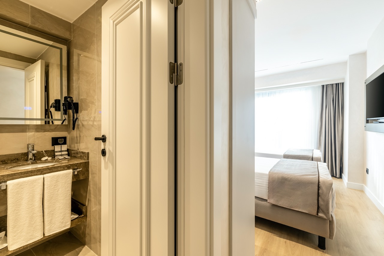 Burada odalar sadece birer konaklama alanı değil; bir ruh hâlidir.22–29 m² arasında değişen, incelikle tasarlanmış yaşam alanlarında ışık yumuşakça duvarlara yayılır. French ve Twin yatak seçenekleriyle her detay konforu fısıldar. İki kişilik odalarda sade bir şıklık, üç kişilik seçeneklerde paylaşılmış anların sıcaklığı saklıdır. Superior odalardaki oturma grupları ise günü yavaşlatmak için tasarlanmış küçük bir sahne gibidir; bir fincan kahve, bir kitap, bir İstanbul akşamı…