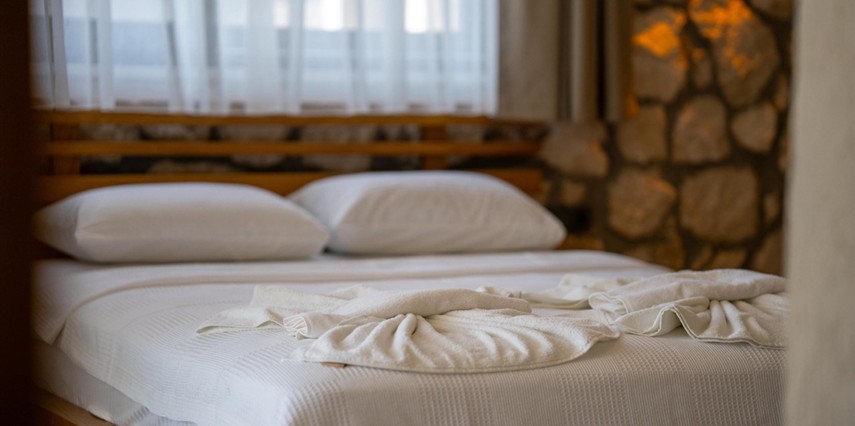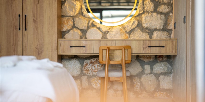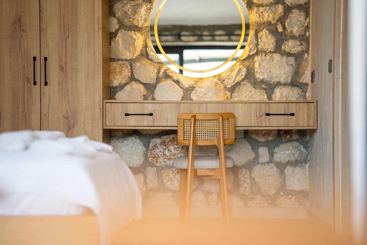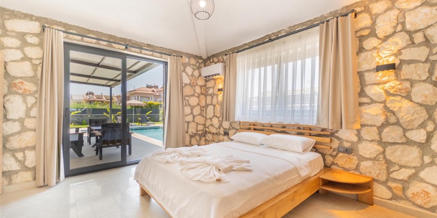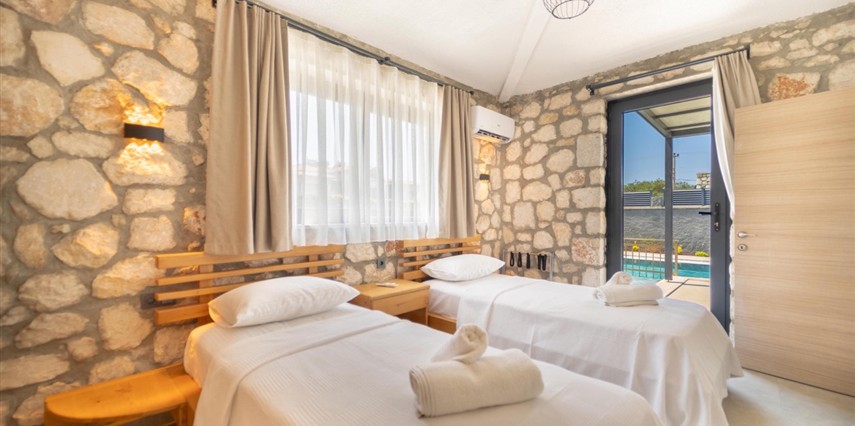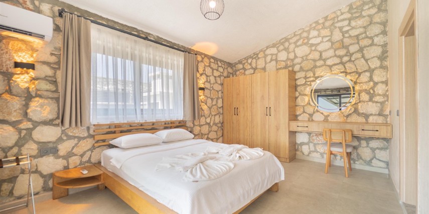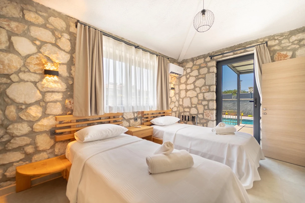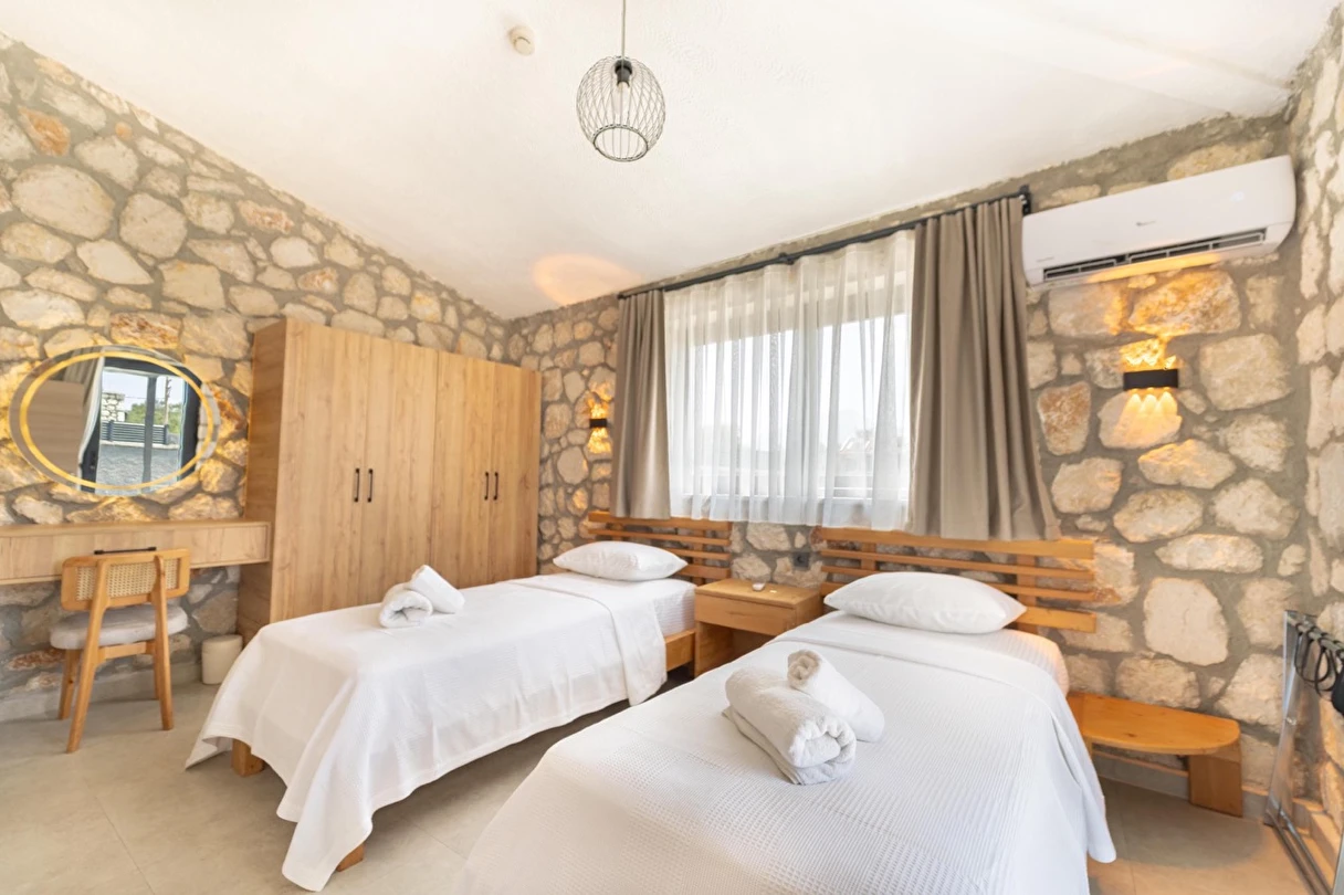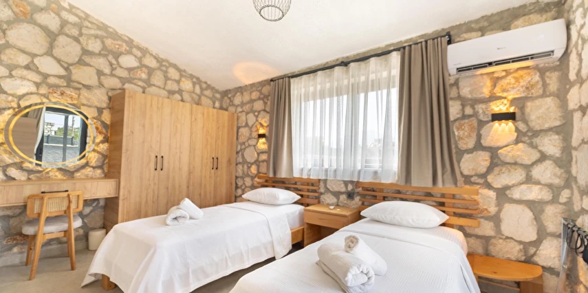 Her biri 2+1 olarak tasarlanan sekiz özel villada, iki yatak odasının her birinde kendine ait banyo ve tuvalet bulunur. Güne uyandığınızda, pencerenizden içeri sızan ışık, taş duvarların gölgesinde dans eder. Gardırobunuzda giysileriniz düzenle bekler, makyaj masanız ve aynanız sizi güne hazırlamak için zarif bir köşe sunar.
