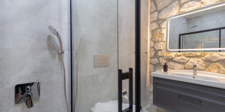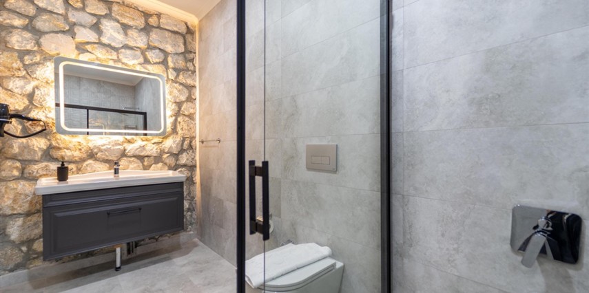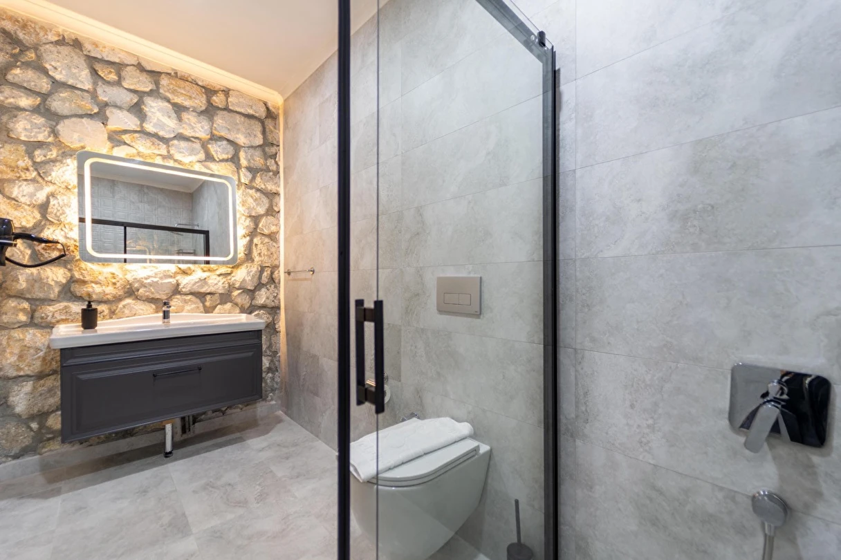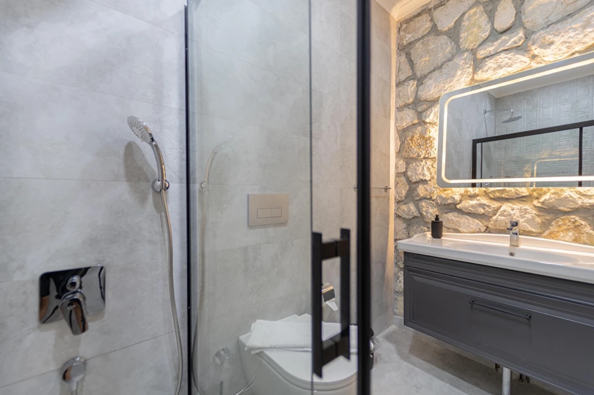 Tüm odalarda inverte klima, yılın her mevsiminde ideal sıcaklığı sunar. Taş duvarlar ise hem yazın serinliğini hem kışın sıcaklığını fısıldar.